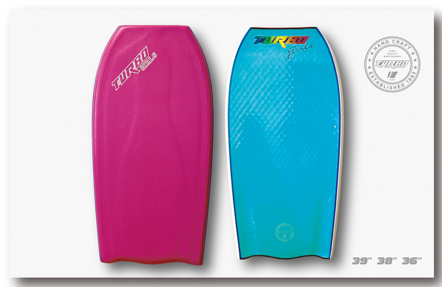 女性に最適な50㎜の2レッドコアとボトムメッシュを使用することでバネのように弾むようなプロジェクション性能を向上させたコントロール性能重視のハイパフォーマンスボードに仕上げています。レベルを問わずに使用することができるTURBO8 BAT TAIL はアマチュアライダーだけでなく、プロボディボーダーも実際のコンテストで使用しています。39インチから36インチまで4サイズを用意しているので多くの方にジャストサイズで選ぶことができるボードとなっています。