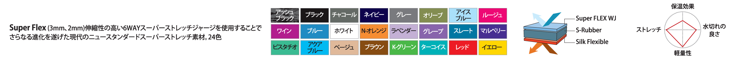 - ストレッチファスナーを5/9短縮することで、肩周りの厚みとファスナーのストレスを軽減 パドル動作や運動性を向上させる設計ジップ部にもストレッチファスナーを採用し、快適な着用感と防水性を両立肘・膝に「かの子ジャージ」**を標準装備(耐久性強化)