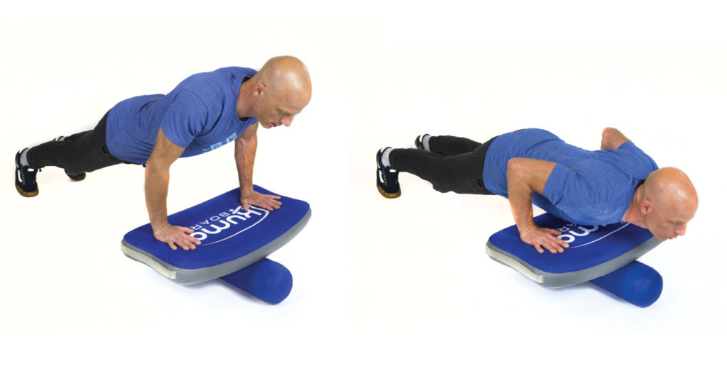 上の写真のようにボードとローラーを使いバランスを取りながら、腕立て伏せを行ないます。もし、バランスが取れない場合は、ローラーをクッションに変えて行ってください。 6回~12回自分のレベルに合わせて行い 30秒休憩を入れて3セット行いましょう。最初は、バランスが取れなくてグラグラすると思いますが、ゆっくりと安定した体勢を保ちながら腕立て伏せを行ないましょう。バランスが取れない場合は足を開くと安定します。