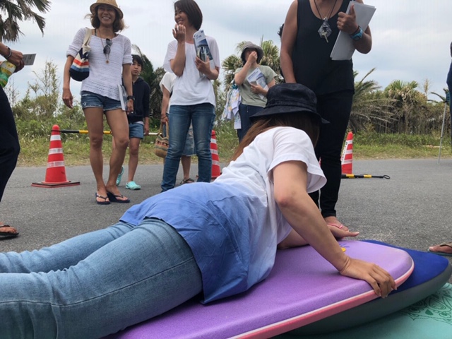 ボディボード用のイメトレレッスン会ではクモボードを使って腕でボードをめくり上げずに、肘と腰に体重をのせる方法を体験してもらいました。ボディボーダーはこのレッスンに興味があったようで大人気でした。写真の時は、ムラサキスポーツの溝口プロに同行していたお客様に体験して頂きました。