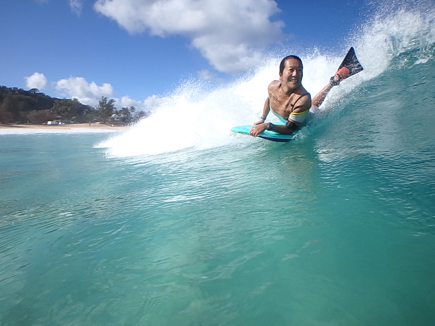 TURBO SEモデルは、初心者に向けてボディボードの重要なテクニックであるテイクオフ、ボトムターン、カットバックなどの基本テクニックの習得に最適なボードとなっています。 (写真はボトムターン)