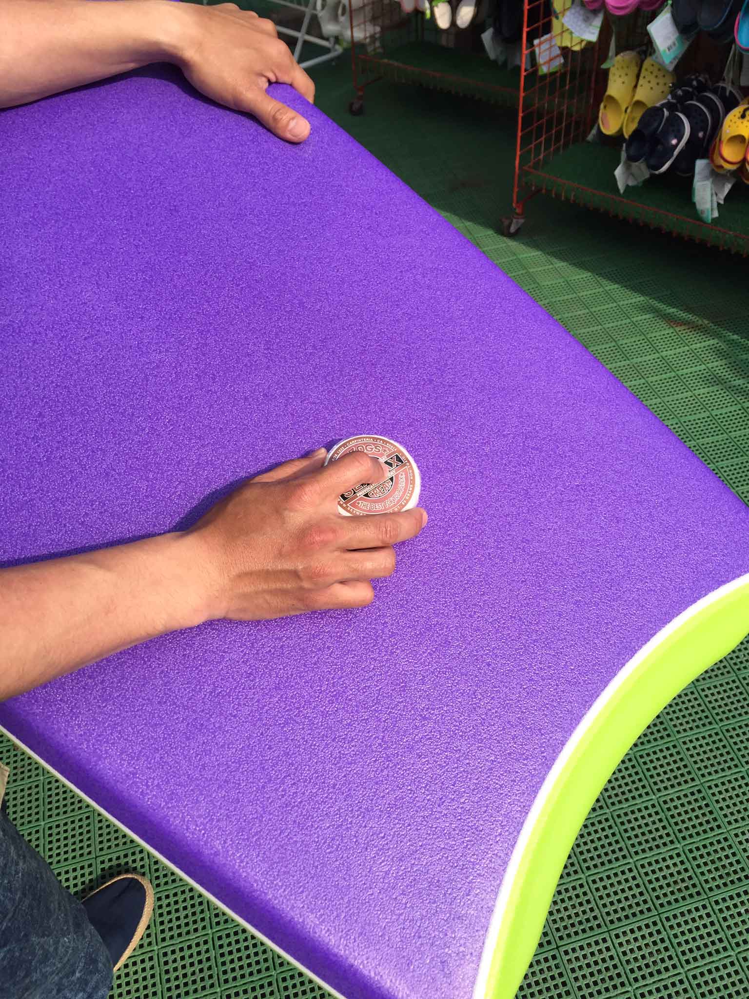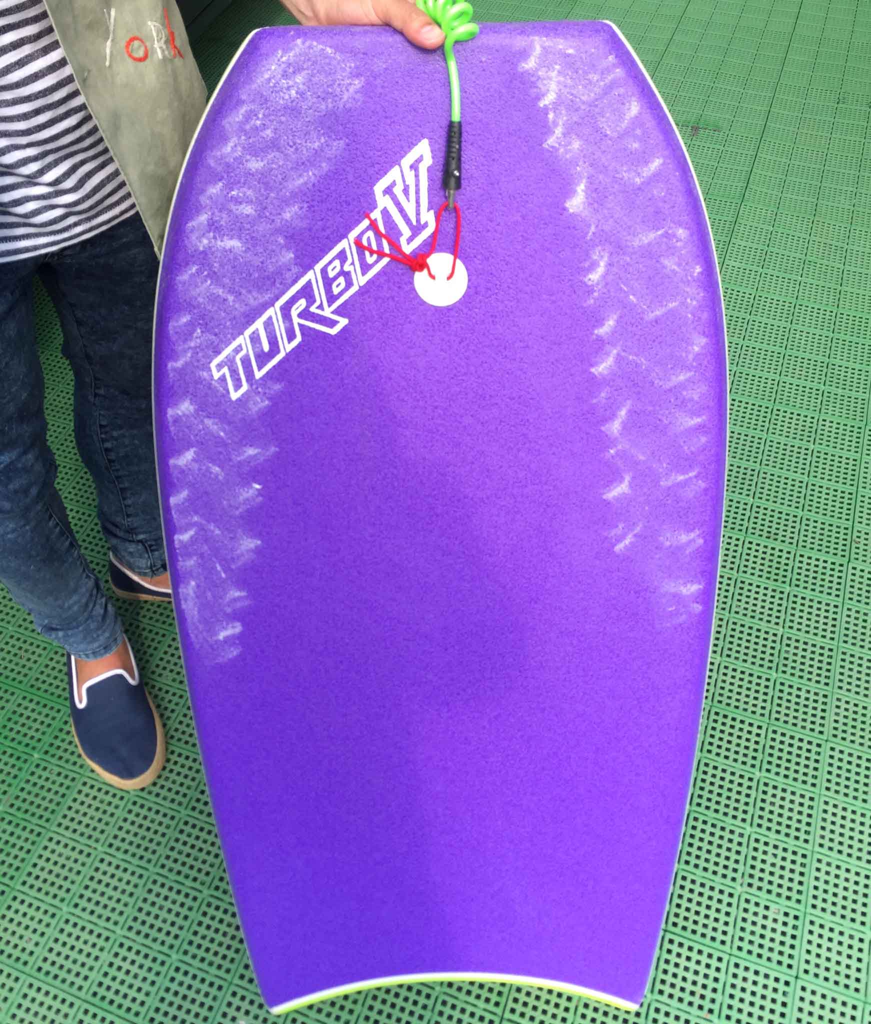 お腹を乗せる場所には塗らないでください。ボディボードはデッキの上での体重移動でボードをコントロールするのでお腹の位置に塗ると滑らなくなってしまうのでボードコントロールができなくなってしまいます。
