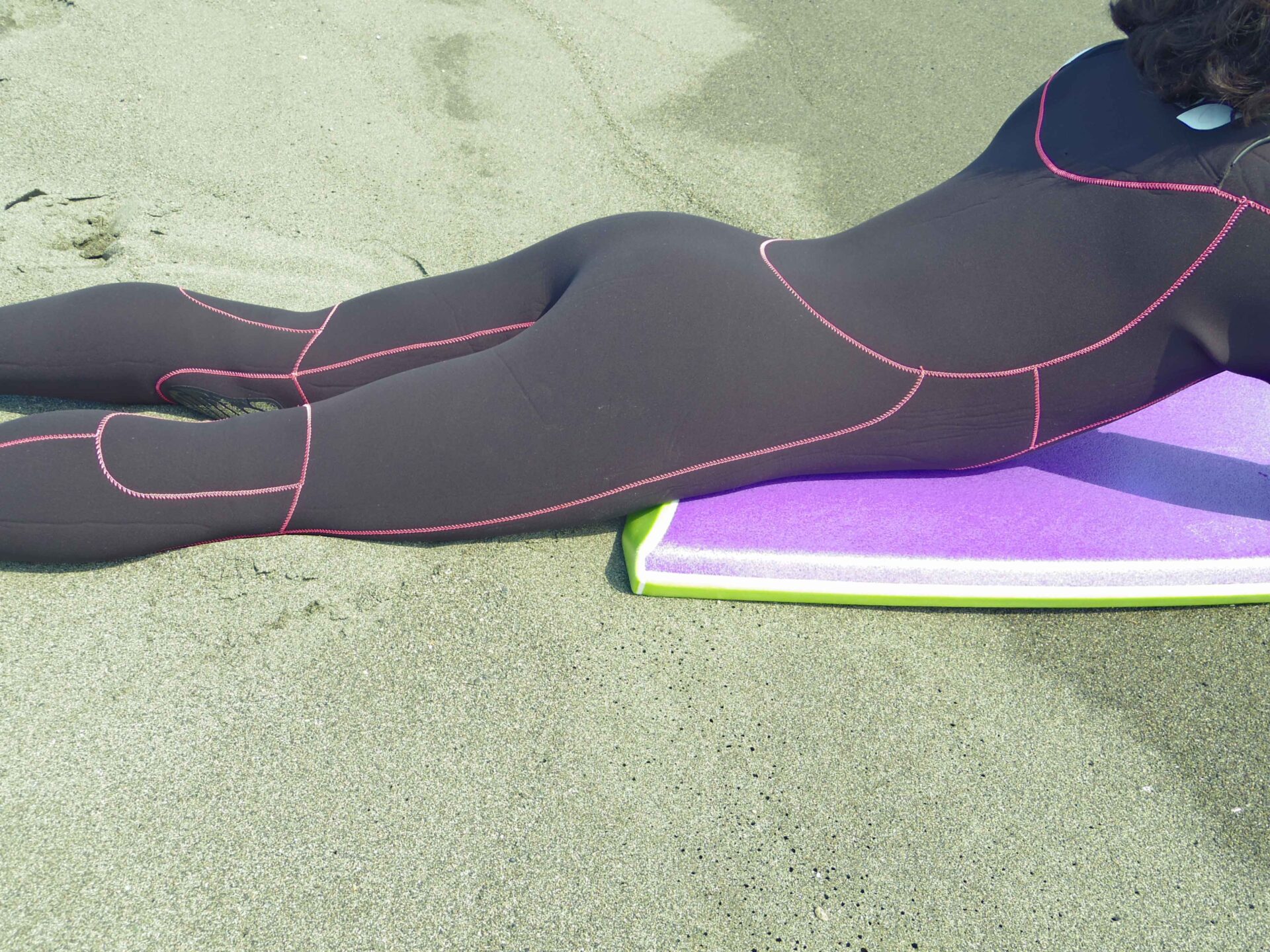 ボディボードの基本姿勢の一番目 沖に向けてフィンを漕ぎながら進むときの姿勢です。
